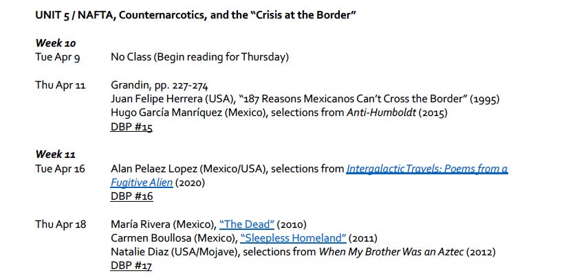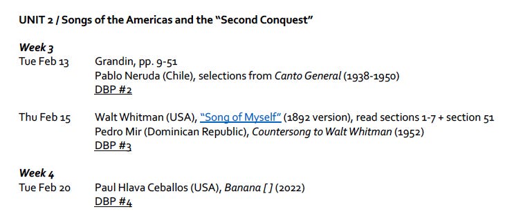 “the so-called Banana Wars, the disintegration of the Good Neighbor era, the inter-American Cold War [what?], US-backed dictatorships and occupations, the neoliberal national security complex, and how these foreign policies "come home." Writing in real time or decades later, we consider how poets "sing," witness, document, confront, or denaturalize [🙄] these hemispheric realities, write in tension or collaboration with others across borders, and create transformative knowledges that allows us to see—and read—the American hemisphere differently.”