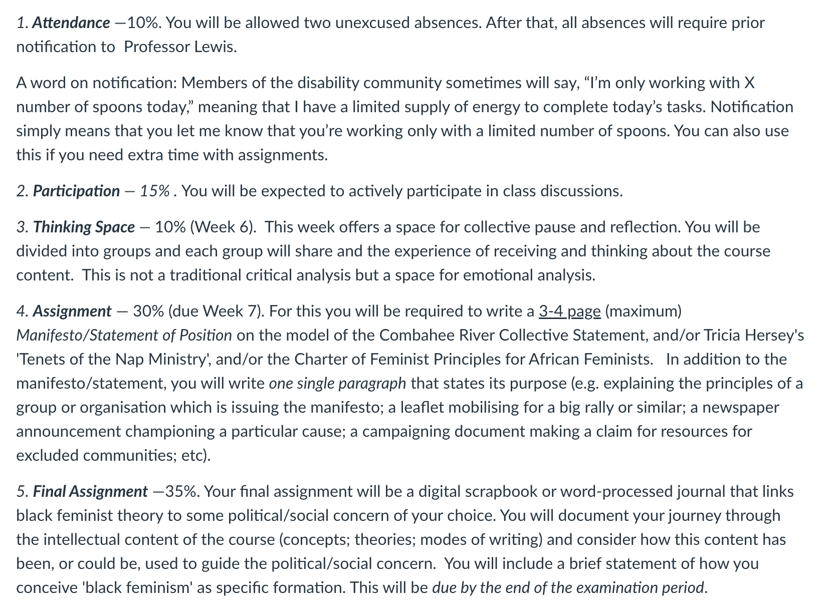 Recall the “Bodies and Pleasures” class which involves writing a total of 5000 words—or consider Black Feminist Theory, which asks students to, over the course of an entire semester, produce a 3-4 page “manifesto” and a “digital scrapbook.”8
